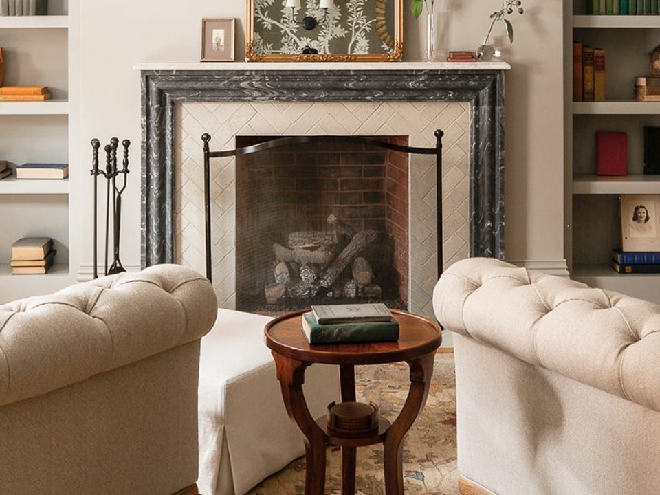 A sleek and understated gray marble frame props up a lighter mantel surface and tiled surround. The interior designer opted for two comfy, oversized armchairs facing the fireplace rather than a sofa angled towards two chairs or a wall to ensure an extra cozy and intimate fireplace experience.