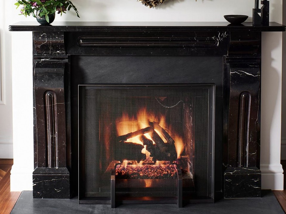 Look closely and you will see that the two support columns are deep maroon. This colorful accent spruces up the inky black facade. A modern and eccentric mirror above the mantel doubles as artwork and sets the scene in this moody, art gallery-esque living room designed by Nicole Hollis Studio.