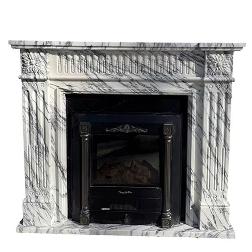 A French style marble chimneypieces of 18th century design having carved rosettes on the corner blocks above console jambs