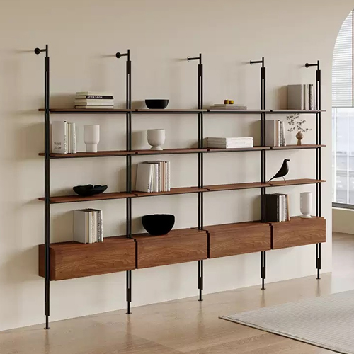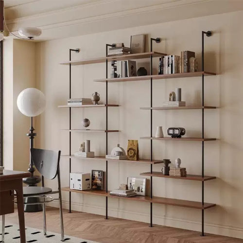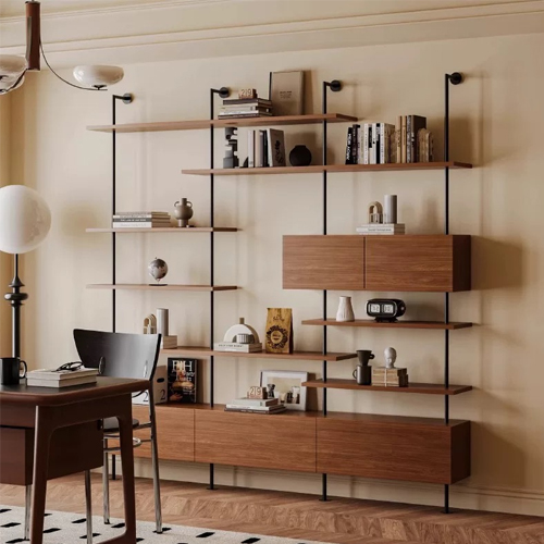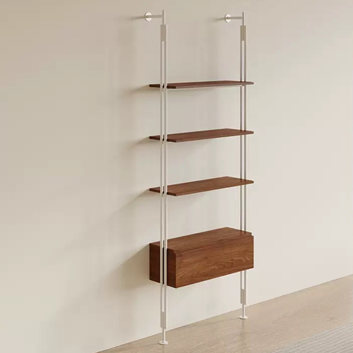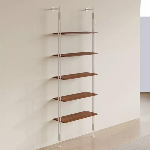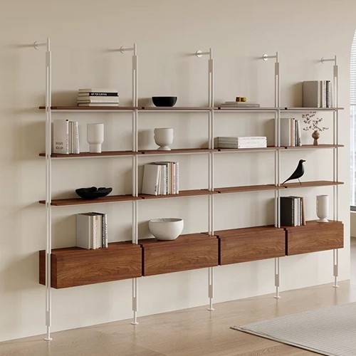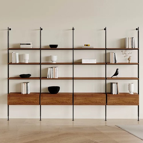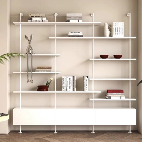 Wall mounted open concept storage and shelves system with metal column and post for easy access and management, Italian design minimalist style